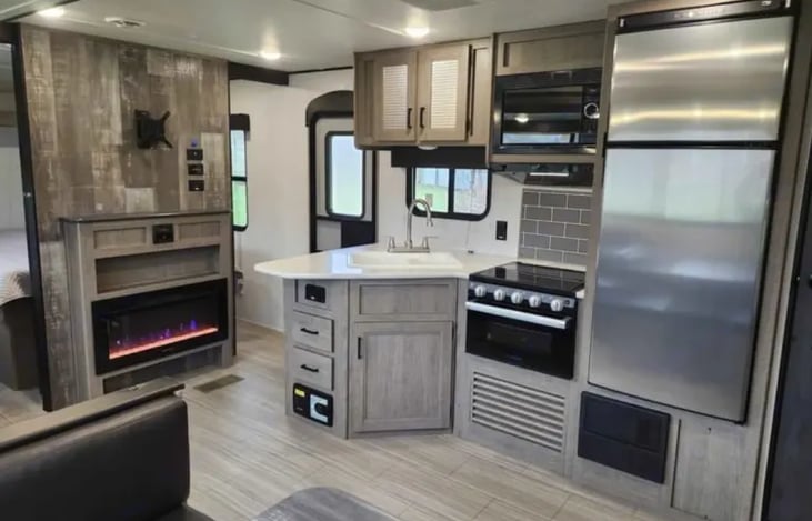 This beautiful bunkhouse has everything you need from cooking utensils to extra blankets. Don’t forget those chilly nights to cozy up next to the fireplace. The pantry is ready to be filled up along side the full size RV fridge. But wait there is more! The awning has memorizing blue lights to light up at night.
