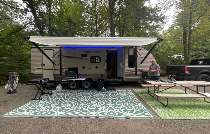 Let my family and I set you up for a great weekend in the woods! This camper is 29 ft long with one slideout table/bed combo, one queen sized bedroom in the front, 2 sets of full sized bunk beds in the back. Sleeps 5-6 comfortably.