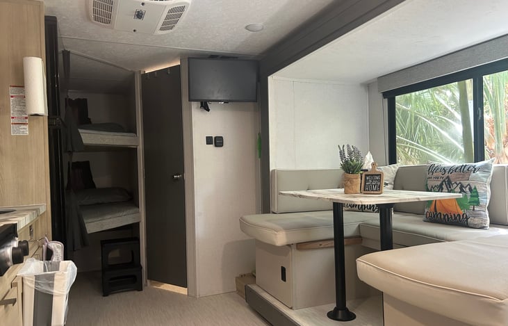 Our RV is a well maintained, clean and spacious place, 22’ easy towing unit ready for camping with the whole family, Fully Stocked--Includes linens, dishes and cookware," "RV Rental Delivery and Set-Up," "6 Person RV Rental with 3 full beds" what we showed in pictures is what you get with the rental, making your campsite as your own home.