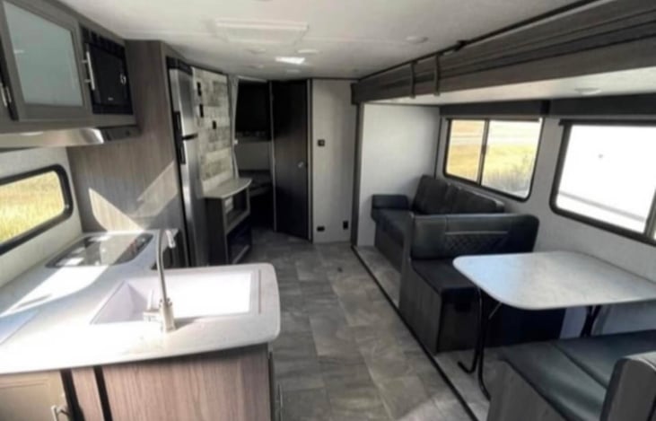 Our RV is perfect for a family looking for something for the Camporee event coming to Gillette, WY! It sleeps 10, 8 adults comfortably! Comes equipped with a stove top, refrigerator and freezer, outdoor fridge, two full sized bunks along with a king sized bed up front. The couch pulls out into a bed along with the table and benches converting into a bed.