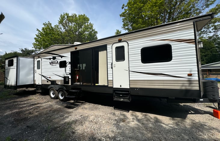 Wow check out this huge 40 plus foot camper with 4 slides creating a huge home on wheels. The back bedroom as 2 slides with 3 beds. The front bedroom has a queen bedroom and the middle section have vaulted ceilings with a fan and huge gathering area with a large screen tv.