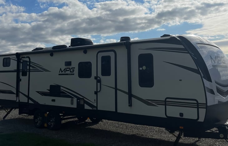 Fantastic family trailer! It sleeps up to 8 people comfortably. There's a king bed at the front, two bunk beds at the rear as well as floor mattress pads. Both the dinette and couch convert into beds. It also includes an outdoor stove and grill, mini fridge, shower, and an automatic awning with LED lights. Comes with Bluetooth indoor/outdoor speakers.