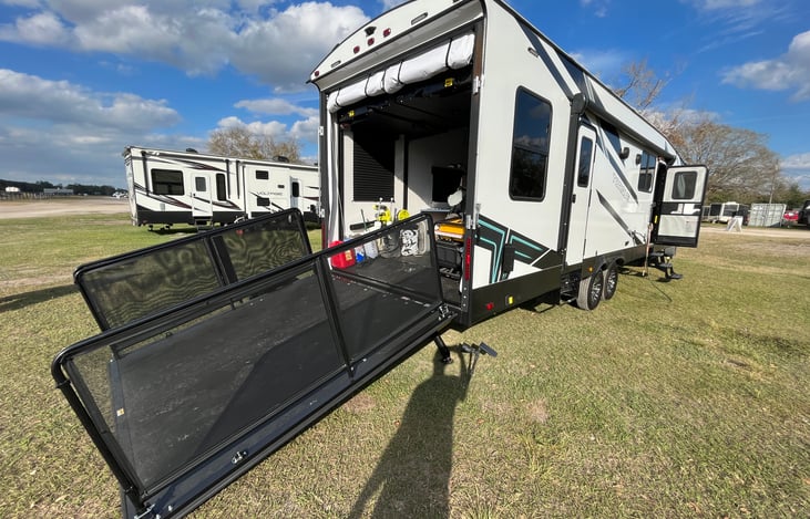 Our pet friendly toy hauler is the way to go for any rv’ing you have in mind. With a 12 foot garage that turns into a bedroom and 8 total beds, you have plenty of room for a family and your toys. Any questions, reach out, we are happy to accommodate.