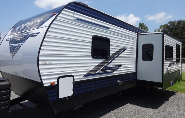 Hello from our 2025 Palomino Puma It's a 34ft Travel Trailer with one slide out that will comfortably sleep 7. We have a queen master in the front of the RV that provides some privacy from the kids as they escape to their double bunk room at the far other end.