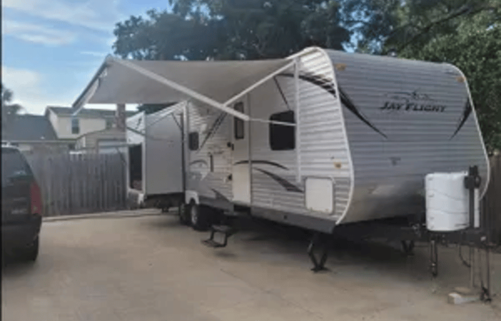 This is a 32' Jayco Flight with 2 slide outs. Features an outdoor kitchen with Blackstone 30 in griddle, mini fridge and flat screen smart TV.
