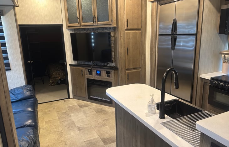 Prepare for the ultimate luxury camping experience with the Rollin Rogue 2-entry RV! As you enter the living room, you'll be greeted by a leather sofa, electric fireplace/heater and a flat-screen TV that sets the stage for cozy movie nights on the Roku Stick. The kitchen is stocked with main essentials for cooking/eating, along with a stove top griddle & gas stove.