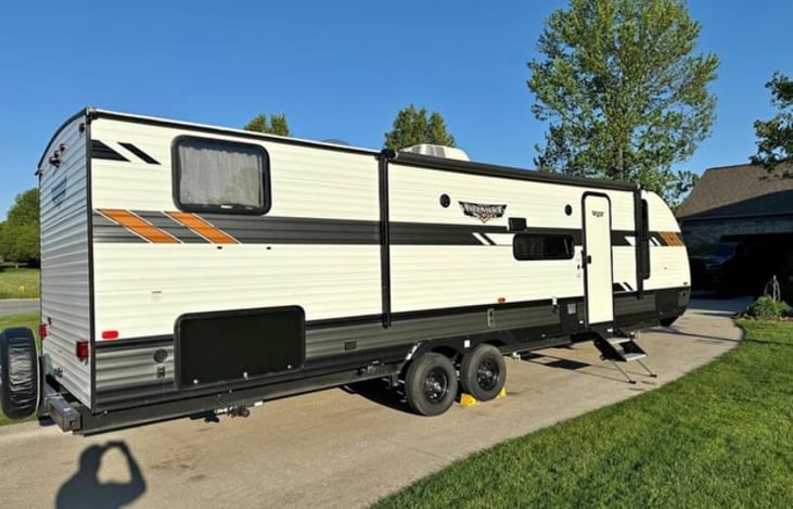 Amazing layout inside, full kitchen and huge fridge and freezer as well as a mini fridge outside with a slide out Blackstone! Bunk beds for the kids, a queen bed in the master bedroom, and table and couch both fold into beds that will easily sleep 2 adults each! Bathroom with shower/tub.