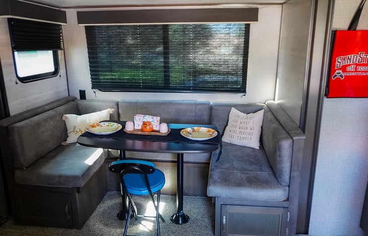 This towable RV is perfect for small families or couples. It has 2 full-size double bunks, a U-shaped dinette and a private master bedroom. The bathroom is spacious as well as the full size stand up shower. The outdoor kitchen is perfect for camping and enjoying the weather while cooking. There is a bumper-mounted flat top griddle mount at the rear of the RV.