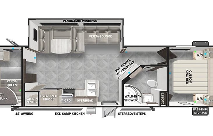 2 BEDROOMS! Wifi TV. Inside and outside speakers. Radio and Bluetooth options. Large pantry. Master closet. Bunkhouse in rear. Solar fridge with freezer. is always on. Bigger than average bathroom. Corner shower. Lots of storage! Sleeps 10. Awning with light. Kid approved! Fireplace with heater. Double kitchen sink. King-size primary bed. Queen bed and 2 twins in bunkhouse. Microwave.
