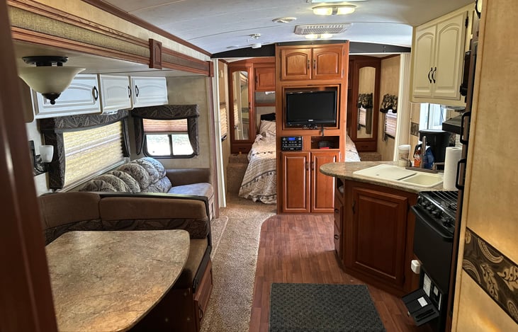 Pet friendly RV. Bunk room with 2 bunks and pull out bed. Tv in bunk room. Linens included in rental. All weather rentals. Available in the winter. Winter edition, insulated for cold weather. Outdoor kitchen area!