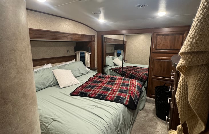 Perfect family fifth wheel with enough room for the whole family! Our camper features a separate bunk room that can sleep up to 3 comfortably with its own private half bath. The living room is spacious and cozy with double recliners, a big tv complete with surround and a dinette. The kitchen area has a middle island with a double sink, oversized pantry and fridge and 3 burner stove!
