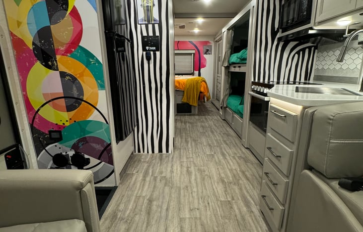 Welcome to the Road’s Most Stylish Secret: a brand-new 2024 Thor Resonate Motorhome, where every mile becomes a masterpiece! Imagine cruising down scenic highways with your besties or family, all while nestled in a vibrant, one-of-a-kind interior that’s bursting with artistic flair.