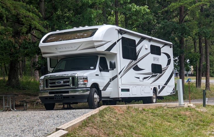 Like new Entegra Odyssey 31F. Perfect for family get-aways, this class C has a queen bedroom, twin bunks with tvs, double overcab bunk with window perfect for stargazing, and additional sleeping options with the jackknife couch and convertible dinette. Super slide creates plenty of room to move around. Bathroom accessible with slide in for use on the road.