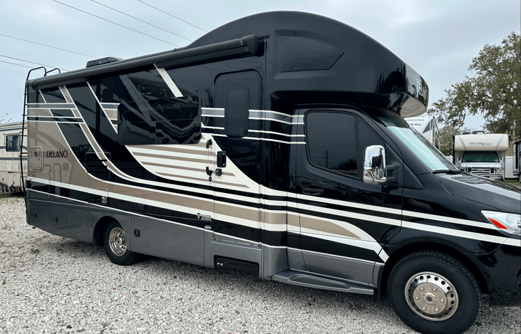 Thor is the #1 selling RV in the world. The Thor Delano 24FB is a Class B motorhome is suited for budget conscious families. It has a Mercedes Sprinter chassis, a 3-liter V6 diesel engine, and a 26-gallon diesel tank capable of 19 miles per gallon. The vehicle has a lot of seating options, including leather captain's chairs that swivel.