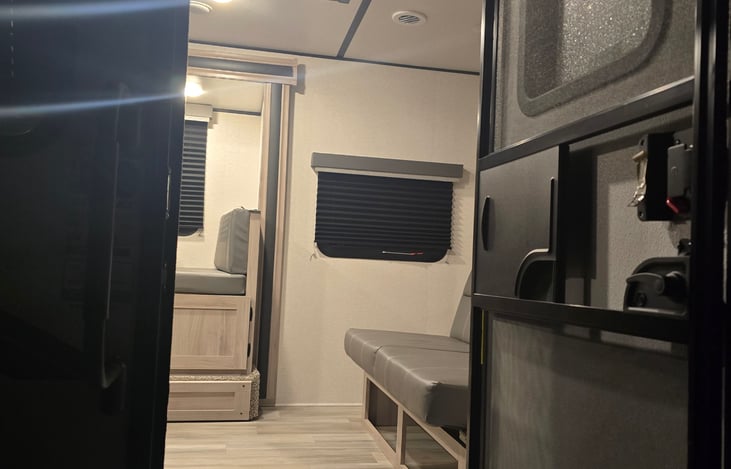 Modern Family friendly travel trailer. Features 2 spacious bunk beds, a queen bed and the booth dinette turns into a twin bed. The bottom bunk folds up and can be used as extra space or bike storage. The kitchen has a three burner stove/oven, a microwave, and a spacious refrigerator. The kitchen has a double sink that can be covered for extra counter space.
