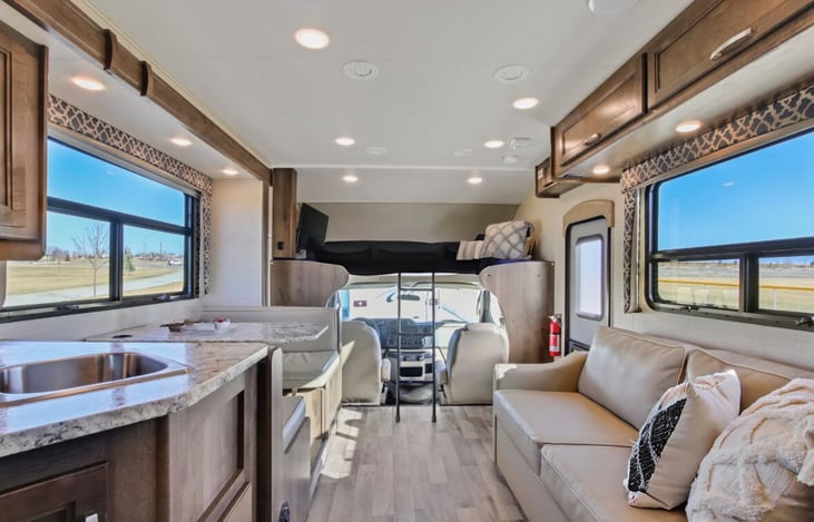 Embark on your next adventure in style with this 32-foot Class C motorhome, perfect for families and groups. Featuring a spacious layout with bunk beds, a queen master bedroom, and a full-wall slide, this RV sleeps up to 10 and offers unmatched comfort. Enjoy a fully equipped kitchen, dual-entry bathroom, and entertainment options like a 32” swivel TV and Bluetooth stereo.