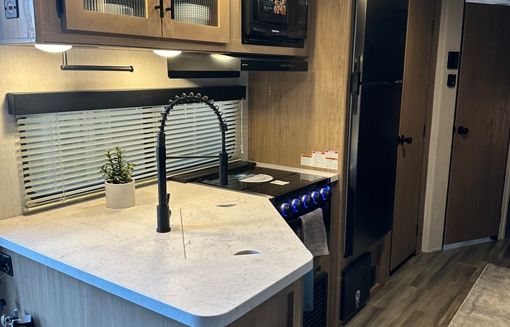 This 2023 Forest River is a bunkhouse RV that is great for the family and sleeps up to 9. With 1 slide out, this trailer gives you enough space for the whole family. The bunkbeds are double bunk with a ladder, a private master queen bedroom with upgraded mattress, a modern kitchen with an oversized pantry, that is stocked with all the necessities for your camping trip.