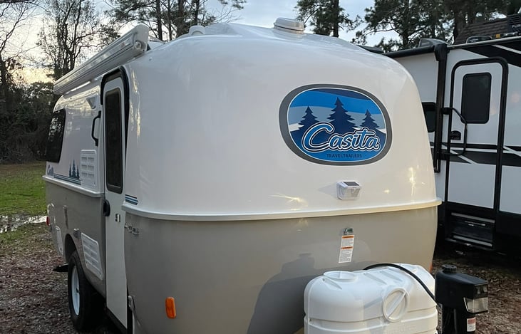 Our cozy high-end Casita 17 Heritage Deluxe has it all: slim efficient roof mount AC, fully self container bathroom, 200W solar with Lithium battery and 2000W inverter, awning with extra outdoor room, outside shower and American made weight distribution hitch.