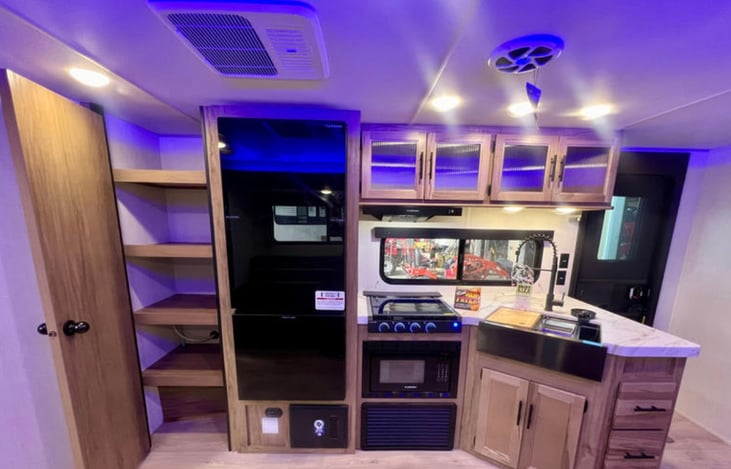 Modern beautiful pull behind coach perfect for families or friends outing event or your casual camping! Host all of the amenities that you can imagine! Outside fridge, wash area, Blackstone grill, ambient blue LED lights, awning, and even has a surround sound system inside and outside for Bluetooth music so everyone can enjoy the evening with a place to hook your TV up!
