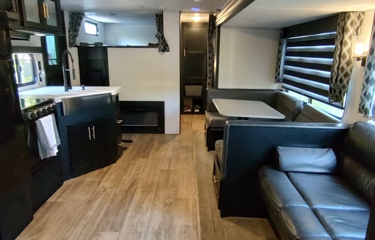 This RV is great for an epic family camping experience. It has a huge bunk loft, tuckaway bunk, a HUGE outdoor kitchen and is roomy enough to sleep up to 9! It comes with everything you need, just bring your suitcase. We also offer free delivery to select parks nearby and charge a small fee for campgrounds within a 30 mile radius.
