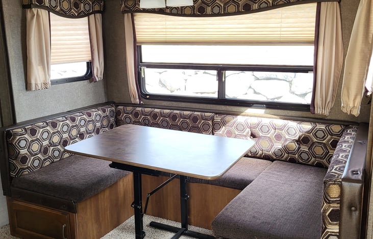 Get ready for fun in this spacious trailer with sleeping availability of 6-8, outdoor kitchen and refrigerator that is electric or propane. For glamping or boondocking, this trailer will meet your needs. Ready to go, and no need to worry about cookware, dinnerware or utensils! All inside and ready for your use. Chairs and outdoor matt provided as well.