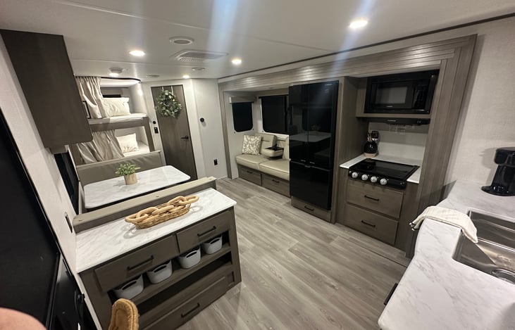 Our new and cozy travel trailer will come jam packed with everything you need to enjoy the best camping experience! The kitchen is stocked with all the cooking essentials you could need. We have all beds prepared with fresh linens and plenty of towels and toiletries for your stay.