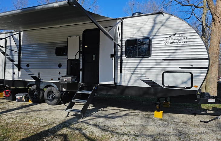 Escape to our 2023 Della Terra travel trailer for a cozy getaway. Perfect for larger friend and family trips.