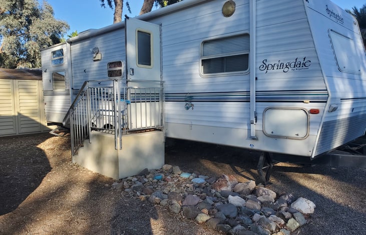 Here's a cozy little 1 bedroom 1 bathroom private camper for a single person or a family, located right on the Colorado River in Needles, CA. Enjoy the Park's facilities (showers, laundry, gym, BBQ pits) as well as wifi internet. There are boat/jetski ramps and a pet beach !