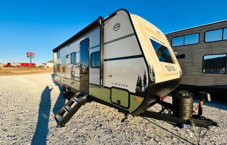 Plan your getaway in our new 2025 NoBo 20.3 travel trailer! In addition to a fully equipped interior, the camper features an outdoor shower, outdoor griddle with exterior propane hookups, 200 watt solar panels for boondocking, and some very cool aesthetics. This camper comfortably sleeps 5 people or if you have small children, you can sleep up to 7 people (2 people per bunk).