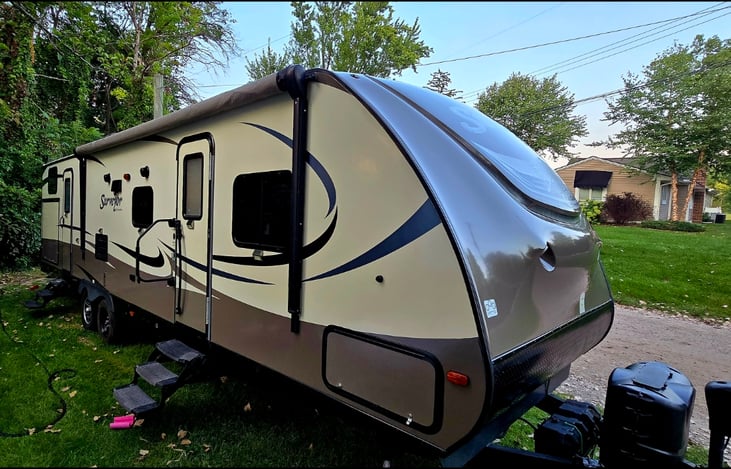 Our travel trailer is perfect for your family or friends with 2 electric slides for extra room, push button outdoor awning.