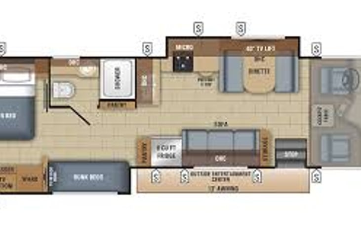 This Class A Jayco Alante is a 33' gas unit that sleeps 8-10 people. Features a queen-size bed in the rear master, followed by bunks with TVs for each bunk—another couch upfront across the dinette and kitchen area with fridge/freezer. The unit also has a power fold-away bunk over the cab, an outdoor entertainment center, and more! There is room for everyone!