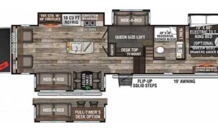 Family friendly, spacious 5th wheel ready for you! Features 2 bedrooms, spacious patio