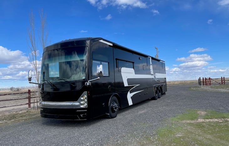 The coach is known for its spacious interior layout, which includes multiple slide-outs that create a large living area perfect for entertaining guests or relaxing after a long day of driving.