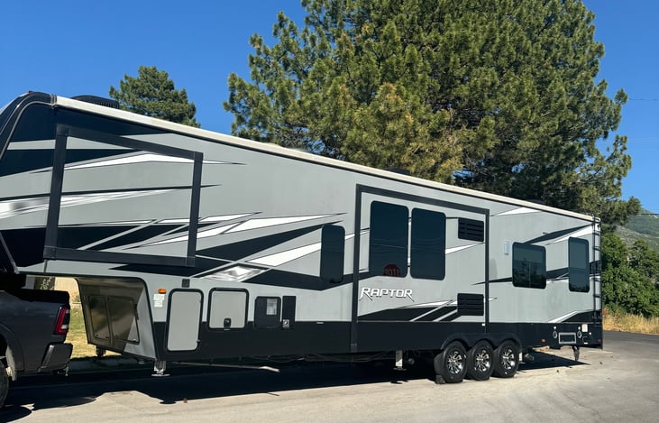 Beauitful Pet Friendly Raptor! Inside and out, this thing has luxury written all over it. From the party deck with full gate and sliding patio doors, to the outdoor kitchen with a grill and tv, to the auto level system to help setup and takedown. Or controlling the entire trailer from a screen right next to your room? This trailer is fully loaded with some great features below -