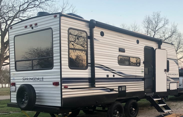Our travel trailer has a refrigerator, microwave, gas cook top, over head and under the sink cabinets, bedside outlets, shower, foot-flush toilet, and plenty of storage space with an exterior pass-through storage. Queen size bed with linens. We can provide coffee maker dishes and disposable utensils if needed. WE OFFER DELIVERY AND FULL SETUP UP TO 35 miles.