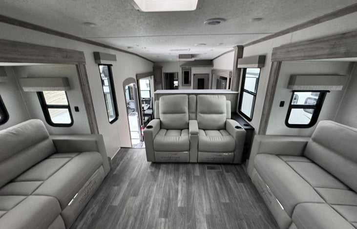 Get ready to roll into your dream beach vacation with Sugar Sands Explorer, our beautiful 2025 Chaparral 334FL Fifth Wheel — designed for travelers who want it all: luxury, comfort, and pure Florida sunshine. Roomy front living area with cozy reclining seating — perfect for relaxing after a sun-soaked day.
