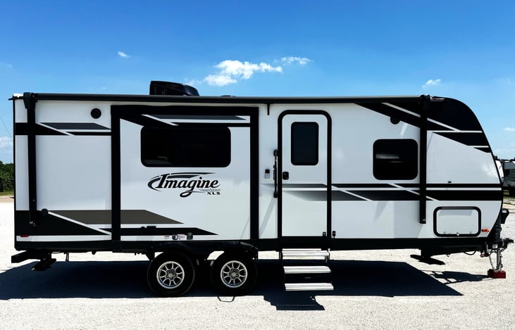 This Imagine XLS is easy to tow and has a very spacious floor plan. Full sofa with end recliners, could sleep 2 in the recliners if wanted. 1 slide out, large rear bath, queen master bed room with tons of storage.
