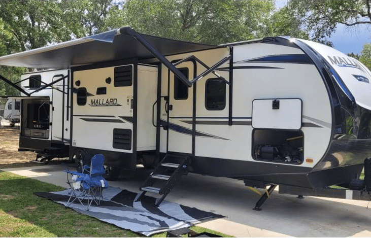 2020 Heartland Mallard M-33. Spacious trailer with ability to sleep 8 comfortably. Has bunk room and master room, 3 slide outs, outdoor kitchen and shower, as well as two entry/exit points. Living room tv can be flipped to face either master room or living room. Large outdoor kitchen with sink, TV and propane connection.