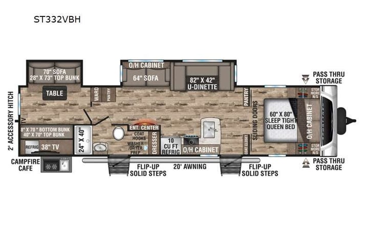Book your next family adventure with our SportTrek 332VBH travel trailer. This beautiful and spacious trailer is wonderful for traveling with kids. The bunkhouse bedroom has a slide out with room to play or just having your own space on rainy days. The master bedroom is private with sliding doors, and the bathroom is a nice spacious area with a large shower.