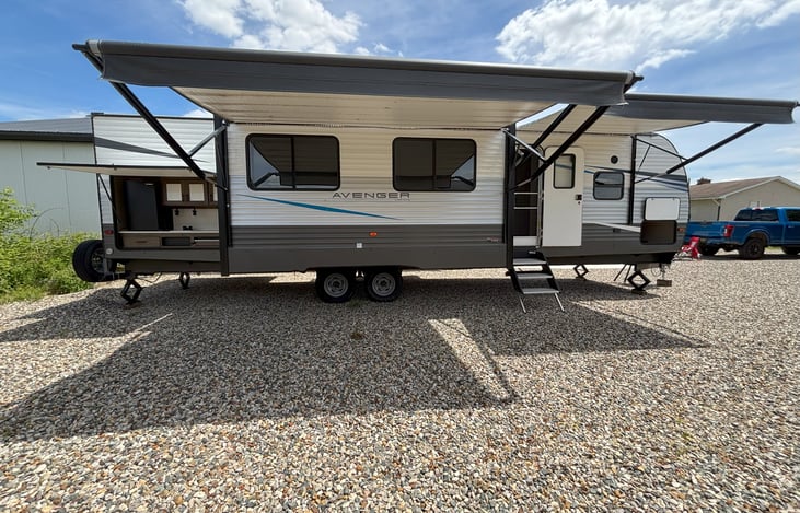 Spacious travel trailer that will accommodate 9 guests. Center island for food prep, outdoor kitchen with mini fridge, sink, and two burner stove. Dual awnings on door entry side and outdoor shower. Stow-able Blackstone cooktop stored in front compartment. Two large outdoor rugs. Outdoor/indoor Bluetooth speakers.