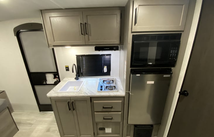 Clean and brand new well cared for RV. Delivery available. This 17' travel trailer is light weight and easy to tow. It has a queen bed, fold down dinette, and bunk beds. Mattresses all have waterproof covers. Camper is stocked with plates, cups, utensils, fry pans, saucepan, Keurig coffee maker, toaster, flat top propane grill, 2 camp chairs, and an outdoor rug.