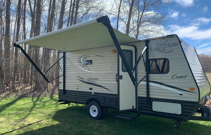 The Cadet is a great little camper; lightweight, easy tow, sleeps 5 with a full bed, 2 bunks and a fold down dinette. Ample storage. Comes with everything you need for your next camping adventure, including cooking and eating supplies, drip coffee maker and paper products. Two outdoor chairs and rug for sitting under the push button awning.