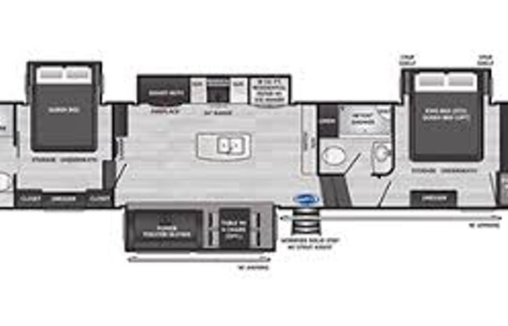 Single-owner, clean, and gently-used. This luxury and spacious 5th wheel has two FULL bedrooms AND two FULL bathrooms. The master bedroom has a king-sized mattress, and the guest bedroom has a queen. It also has a large loft bunk area that sleeps even more guests. The private guest bedroom has its own sink, toilet, shower, and entry door at the rear of the RV.