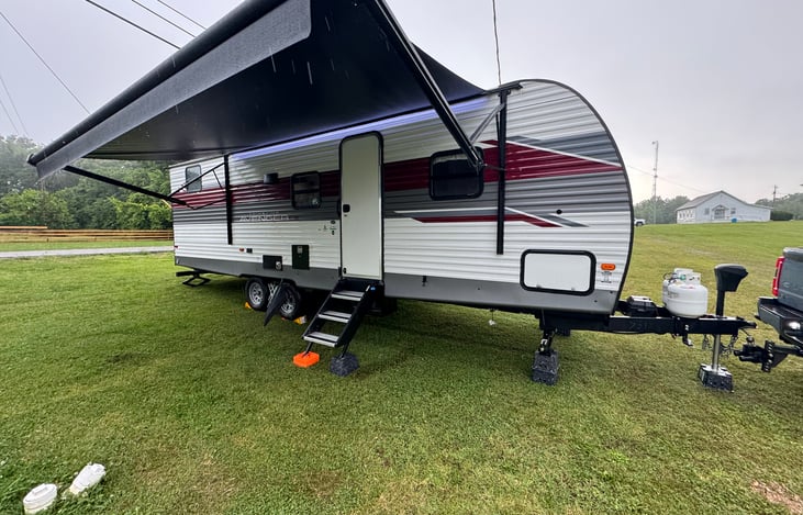 This new 2024 Prime Time Avenger 26DBSLE is a pet friendly camper with sleeping for up to 8 people. The camper has a large awning with LED lights, one slide, and a rooftop air conditioner. This camper is available for delivery only. We will bring the camper to your campsite and set it up for you. All you have to do is start your camping trip.