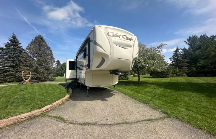 Very beautiful 5th wheel with 3 slides, king bed and large living space. Great for groups of 6 or less guests.