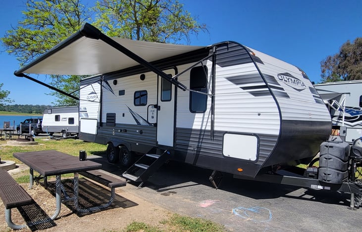 Embark on your next adventure in our 2022 Highland Ridge Olympia 30' travel trailer. It can comfortably accommodate 8 people with two in the queen size master bed, two in each full size bunkbed, and one each in the sofa bed and dining table. Get cozy in the living room with the electric fireplace and smart TV. There is also a Bluetooth stereo with speakers both indoors and outdoors.