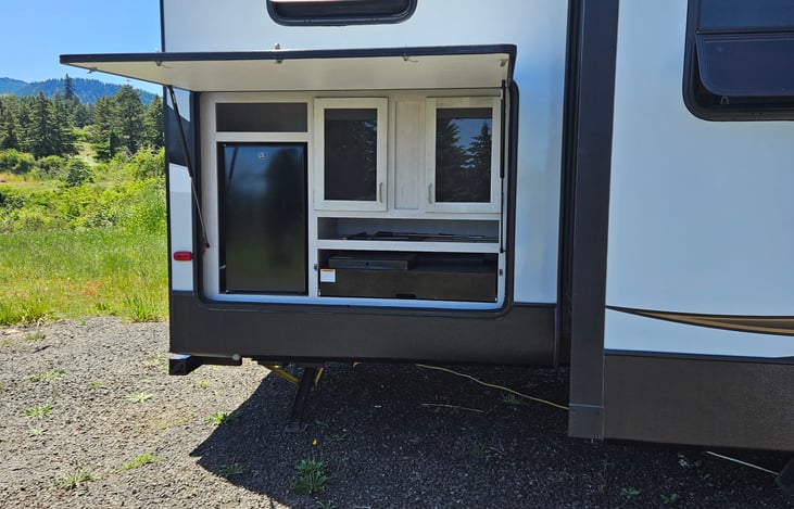 2 full bedrooms, 2 bathrooms. Outdoor kitchen. 2 ac units. Bedroom one sleeps 2. Bedroom 2 sleeps 4 with bunk bed. 3 slides.