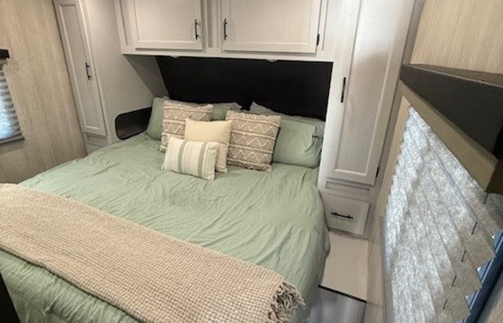 A brand new 2025 275CRXL is available for your adventures. This unit has only been used a few times for family trips. There is alot of room including a garage that will fit a 4 seat side by side. Garage depth is 14' and a max height of 74". Bathroom is large for your needs. Unit offers central air conditioning, furnace, a private master bedroom with a king size bed and a 42" TV.