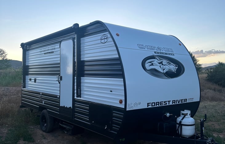 This brand new travel trailer is fully equipped with fresh and cozy bedding, basic kitchen supplies, stove top coffee percolator, camping chairs, bathroom linens and hygiene supplies, top of the line heating and A/C, board games, and so much more! This is the perfect space to get away and enjoy the great outdoors without sacrificing luxury.