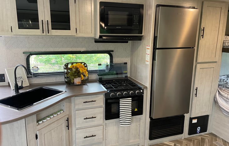 Make memories for a lifetime in a brand new completely furnished RV. The trailer is designed for family adventures, featuring spacious sleeping arrangements with double full size bunks and a cozy queen bed. Along with the bunks, the kitchen table and couch fold into full size beds to fit 8 people.